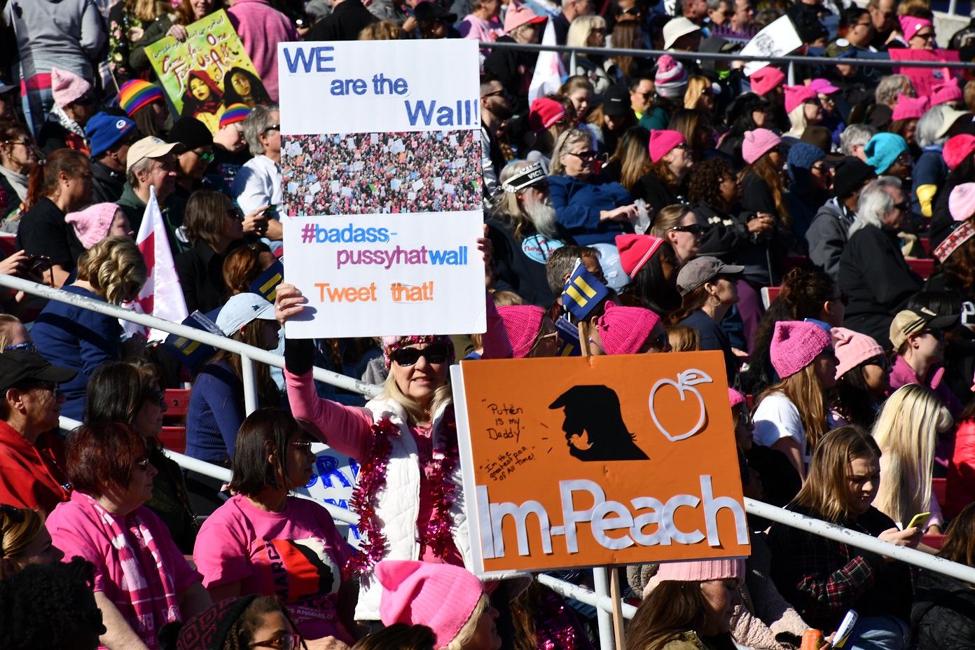 “This is America at its finest. This is what America is about,” Gladstone said as throngs of sign-holding march participants passed by, many wearing signature “pussy hats.”